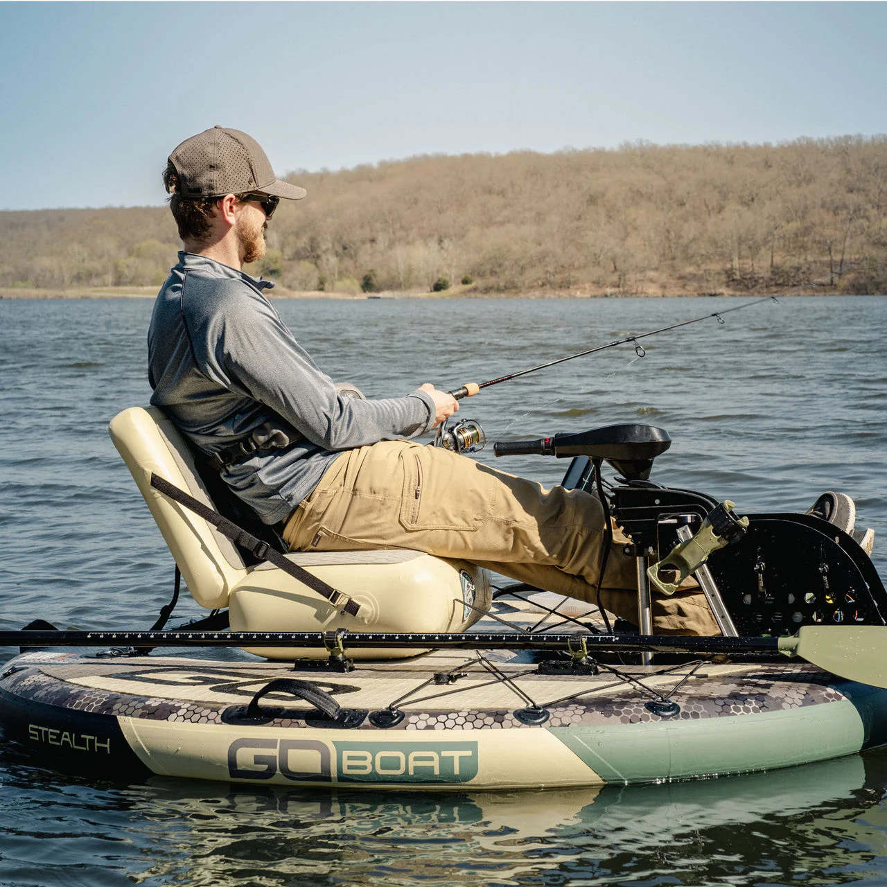 Introducing the GoBoat Fish: your ultimate angling companion! Cast your line from the comfort of your personal watercraft, equipped with ample storage for all your fishing gear and a cooler. Cruise smoothly at 5 mph with our powerful motor, and explore shallow waters that traditional boats can’t reach. Customize your fishing experience with accessories like rod holders and a fish finder. After reeling in the big catch, deflate and stow your GoBoat for easy transport and storage until your next fishing adventure!
